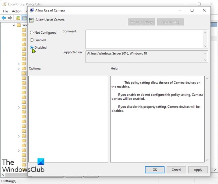 Para desactivar completamente la cámara en su Windows 11/10 a nivel del sistema operativo a través de la Política de grupo, haga lo siguiente: