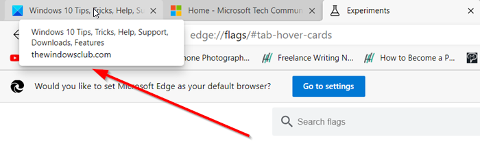 ElNavegador Edge (Chromium)de Microsoft es bastante rápido. Es 'Vista previa de pestañaLa característica funciona cuando pasas el puntero del mouse sobre una pestaña inactiva. Muestra una miniatura de la página web que está abierta en otra pestaña. En resumen, ofrece una vista previa de la pestaña actual a la que apunta en el navegador. Si desea habilitar o deshabilitar esta función, aquí le mostramos cómo proceder. También le mostraremos cómohabilitar o deshabilitar la imagen de la tarjeta de desplazamiento de pestañacaracterística en elNavegador Chrome.