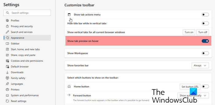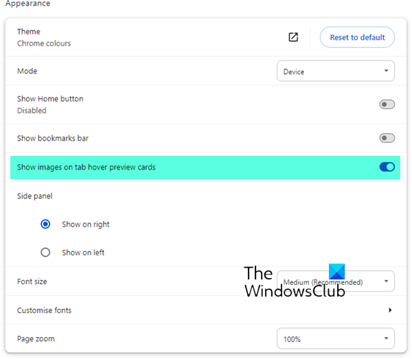 La función está habilitada de forma predeterminada. girarMostrar vista previa de la pestaña al pasar el mouse'Off' tendrás que realizar cambios en el navegador:
