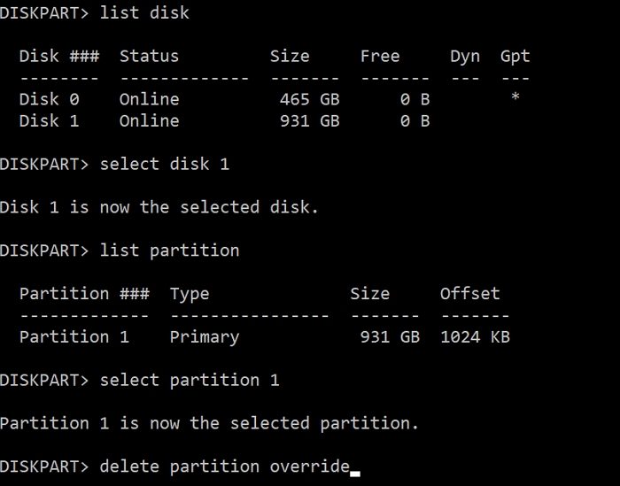 Eliminar partición es el comando que se usa a menudo para eliminar una partición usando el Eliminar anulación de particiónes una extensión del mismo comando pero elimina los bloqueos que impiden la eliminación. Los pasos son similares a los de cualquier eliminación de partición, excepto por la última parte.