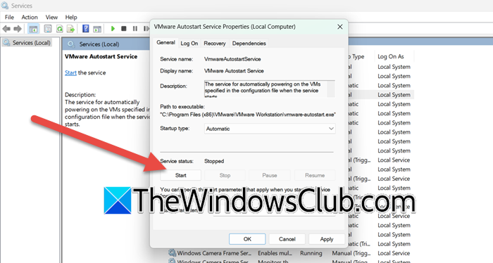 Sin embargo, antes de habilitarlo, debemos verificar y configurar elInicio automático de VMwareservicio. Para ello, abra el“Servicios.msc”aplicación, haga clic derecho enServicio de inicio automático de VMware,vaya a Propiedades, luego cambie elPuesta en marchaescriba a"Automático",y luego haga clic enComenzar.
