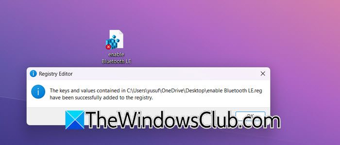 Las claves y valores contenidos en C:\Users\username\OneDrive\Desktop\enable Bluetooth LE.reg se han agregado correctamente al registro.