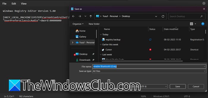 Entonces tienes que ir aArchivo > Guardar como.Ahora, navegue a una ubicación diferente. Le recomendamos que guarde todo en su escritorio a partir de ahora para obtener la máxima visibilidad, asígnele un nombre.Habilitar Bluetooth LE.regoDesactivar Bluetooth LE.reg,cambiarGuardar como tipoaTodos los archivos,y haga clic en Guardar.
