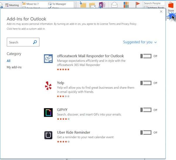 Se abrirá una ventana emergente que le ofrecerá todos los complementos disponibles para Outlook. Para instalarlos, simplementemueva el control deslizante a la posición Activadoy reinicie Microsoft Outlook. En algunos casos, verá unConsígueloen lugar del control deslizante. Para instalarlo haga clic en este botón para comenzar su instalación. Reinicie Outlook para habilitarlo.