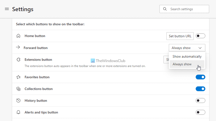 Aquí debes dirigirte alSeleccione qué botones mostrar en la barra de herramientassección, donde podrás encontrar una opción llamadabotón de avance. De forma predeterminada, está configurado enMostrar automáticamente. Para cambiarlo, debe expandir el menú desplegable correspondiente y seleccionar elmostrar siempreopción.