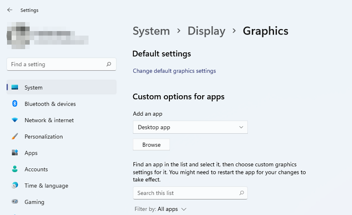 - Seleccione la opción Cambiar configuración de gráficos predeterminada.
