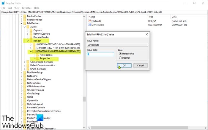 Para habilitar o deshabilitar el dispositivo de salida de sonido en Windows 10 a través del Editor del Registro, haga lo siguiente: