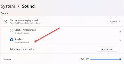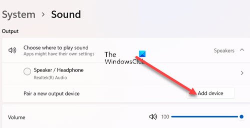 Por ejemplo, si desea utilizar un altavoz independiente, presione el botónAgregar dispositivobotón, adyacente aEmparejar un nuevo dispositivo de salidaentrada.