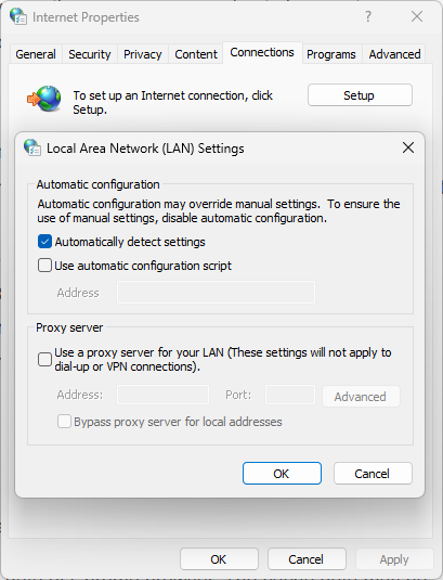 - Aquí, marque elUtilice un servidor proxy para su LANopción y marque laDetectar configuraciones automáticamenteopción.
