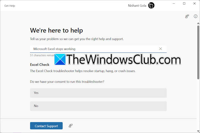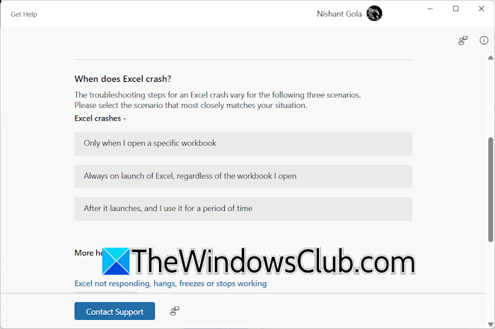 Al desplazarse hacia abajo hasta la parte inferior de la aplicación Obtener ayuda, verá elMás ayudasección que contiene enlaces a artículos útiles para la solución de problemas de Excel. Si necesita más ayuda, puede hacer clic en elContactar con soporteen la aplicación Obtener ayuda y hable con un agente de Microsoft a través del soporte por chat.