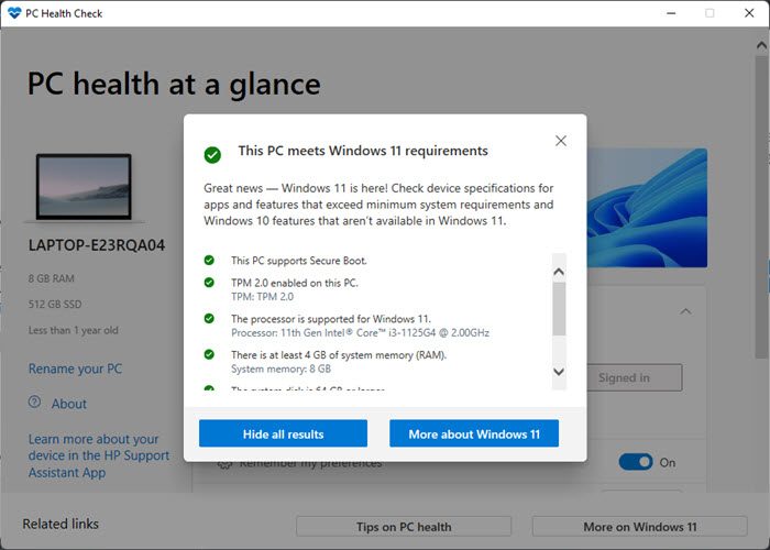 - PC Health Check ejecutará una verificación integral de elegibilidad y mostraráEsta PC cumple con los requisitos de Windows 11si encuentra que su PC es compatible.