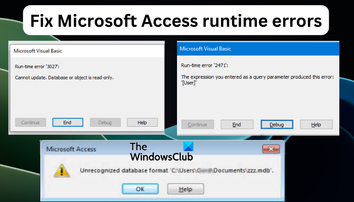 Accesoes una gran herramienta de Microsoft que permite a los usuarios organizar y administrar grandes cantidades de datos en forma de formularios, consultas, tablas e informes. En esta publicación, veremos varias formas decorregir errores de tiempo de ejecución de Microsoft Access 2501, 424, 13, 6, 3052, 3146, 3027, 2471, 3343, 3027, etc.. y qué los desencadena. Estos errores ocurren cuando un usuario intenta iniciar Access o cuando la aplicación se está ejecutando. A veces, un error de tiempo de ejecución desaparece después de reiniciar MS Access y, si no, existen formas sencillas de resolver el problema.