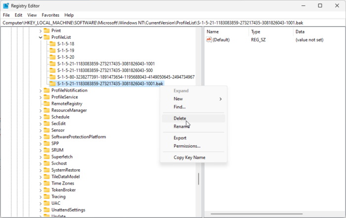 - BajoLista de perfiles, borre la clave con un.bakextensión al final.