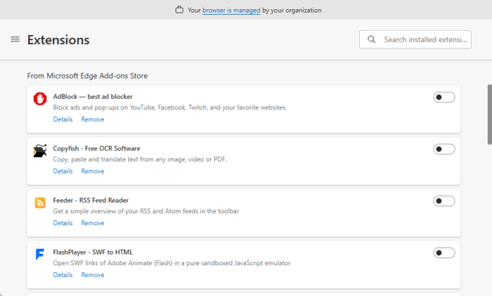 Es posible que las extensiones instaladas estén interrumpiendo los procesos de Edge. Deshabilite todas las extensiones del navegador y luego habilítelas una por una para descubrir al culpable. He aquí cómo:
