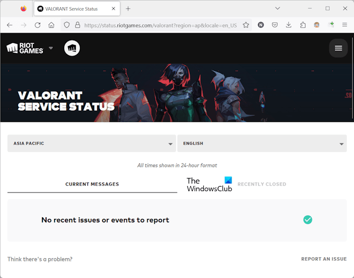Cuando visite el sitio web, verá el estado actual del servidor en elMENSAJES ACTUALESpestaña. Si desea comprobar los problemas con el servidor Valorant, haga clic en Valorant después de visitar el sitio web oficial. Después de eso, verá el estado del servicio Valorant.