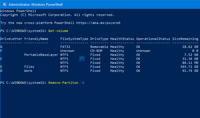 Usar PowerShell para eliminar una partición requiere comparativamente menos tiempo, pero puede que no sea así todo el tiempo. Sin embargo, aún puedes intentarlo si no deseas ejecutar diskpart, lo que lleva un tiempo razonable.