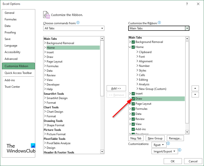 - A la derecha, en el recuadro delPrincipalpestaña, habilite la pestaña Dibujar marcando laDibujarcasilla de verificación de pestaña.