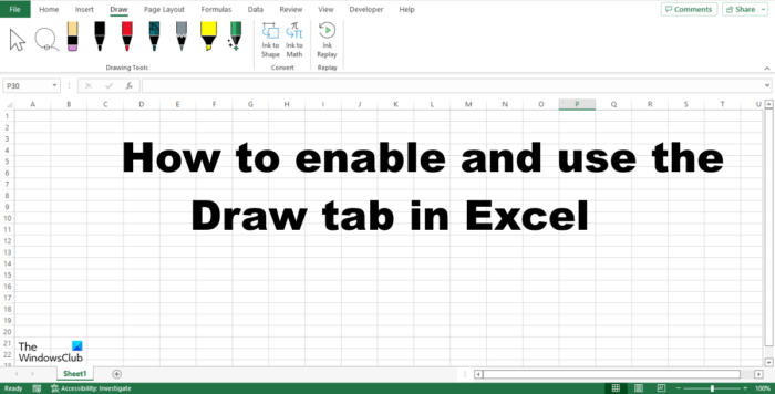 La pestaña Dibujar no está en la cinta de Excel de forma predeterminada; hay que añadirlo, por lo que verás que falta en la cinta. La pestaña Dibujar consta de herramientas que ayudan a los usuarios a realizar bocetos, agregar resaltados, convertir tinta en matemáticas y tinta en formas. En este tutorial, le explicaremoscómo agregar y usar la pestaña Dibujar en Excel.