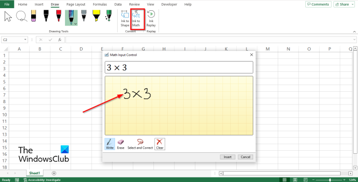 De tinta a matemáticas: convierte expresiones matemáticas escritas a mano en texto. Haga clic en el botón Ink to Math y se abrirá un cuadro de diálogo Control de entrada matemática. Ahora escribe dentro del cuadro. Verá una conversión de las matemáticas que escribió en el cuadro de arriba. Ahora haga clic en Insertar.