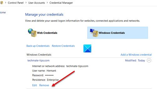 Cuando se abra el Administrador de credenciales en el Panel de control de Windows 11/10, cambie alCredenciales de Windowspestaña.