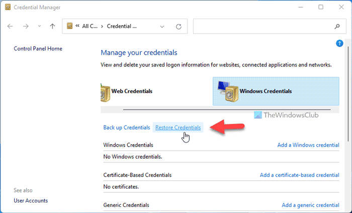 Para restaurar sus credenciales de Windows en Windows 11/10, siga las guías anteriores. Por razones obvias, debes tener el archivo de credenciales y recordar la contraseña que utilizaste cuando creaste la copia de seguridad. Luego, puede abrir el Administrador de credenciales de Windows para completar el trabajo.