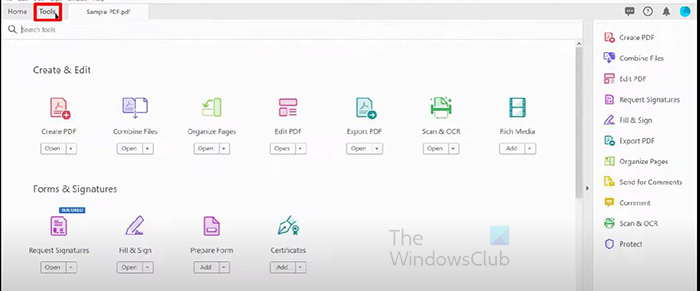 Para eliminar la marca de agua, vaya a la parte superior del documento y seleccione laHerramientaspestaña. Se abrirá la página de herramientas y allí seleccionasEditar PDF.