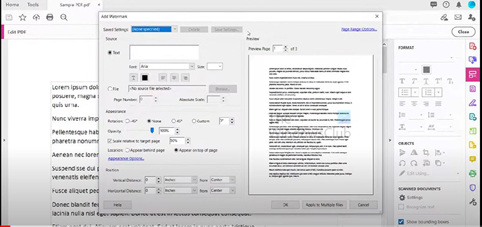Cree la marca de agua en el PDF como lo hizo en elAgregar marca de aguasección de este artículo. Cuando haya terminado de crear la marca de agua, haga clic en elAplicar a múltiples archivosbotón en elAgregar marca de aguaventana.