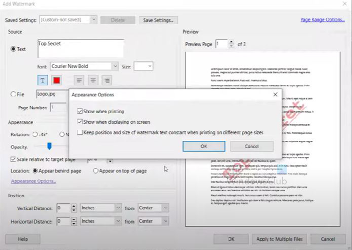 Las opciones de apariencia son un enlace en el que puede hacer clic para obtener más opciones de apariencia. Al hacer clic en el enlace de opciones de apariencia, aparecerá un menú. las opciones en el menú son –Mostrar al imprimir,Mostrar al mostrar en pantallay,Mantenga constante la posición y el tamaño de la marca de agua al imprimir en diferentes tamaños de página. Puede realizar las elecciones que desee y luego hacer clic en Aceptar para aceptar y cerrar el menú.