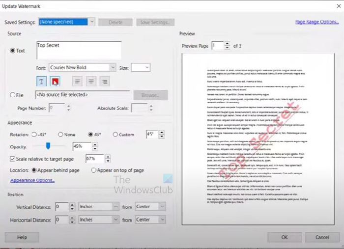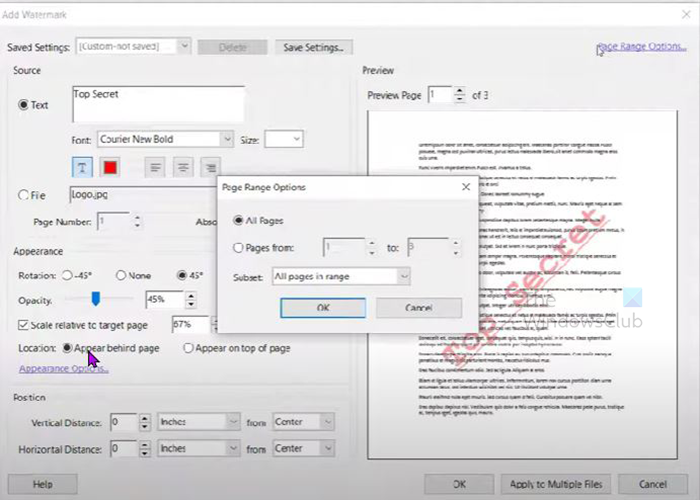 ElOpciones de rango de páginases un enlace en el que haces clic para elegir dónde quieres que aparezca la marca de agua. Esta opción resulta útil si desea colocar la marca de agua en páginas específicas o en un rango de páginas. Si no desea que la marca de agua esté en todas las páginas, haga clic en Páginas de y elija el rango de páginas en las que desea que aparezca la marca de agua. Si tiene un documento PDF de varias páginas y desea que la marca de agua esté solo en una página, coloque el mismo número en ambas casillas. Por ejemplo, si desea que la marca de agua aparezca solo en la página 3, coloque el número 3 en ambos cuadros de valores del rango.