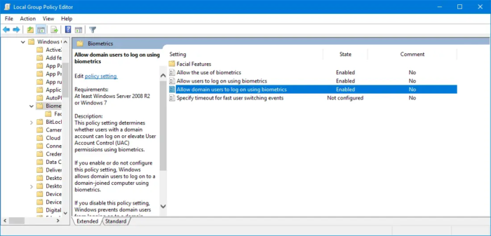- En el panel derecho, haga clic enPermitir que los usuarios del dominio inicien sesión mediante datos biométricosy habilitar o deshabilitar esta política según sus necesidades.
