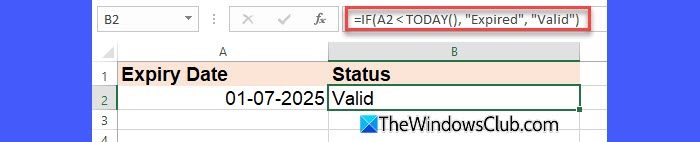 =IF(A2 < TODAY(), "Expired", "Valid")
