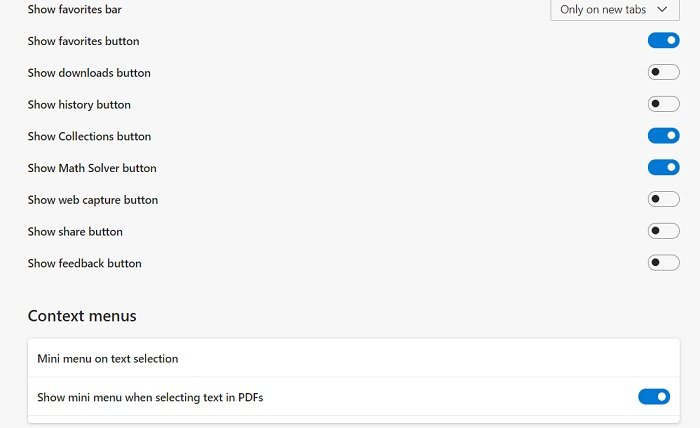 Desplácese hacia abajo y obtendrá más configuraciones de personalización, como seleccionar los botones y pestañas que desea ver en su página de inicio. Puede mostrarlos u ocultarlos según su elección. Además, puede ajustar elMenús contextualesaquí.