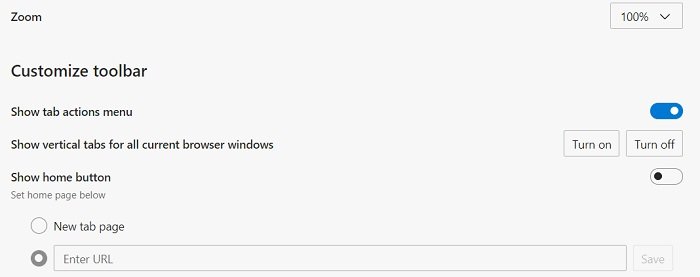 Cuando se trata de apariencia, no se trata sólo del tema; Puedes personalizar muchas más cosas aquí para que el navegador tenga el aspecto que deseas. En la página Apariencia, desplácese hacia abajo para ajustar las otras configuraciones de su navegador. Puede seleccionar el porcentaje de Zoom de su navegador, ajustar la configuración de la barra de herramientas y también cambiar elpagina de iniciosegún sus preferencias.