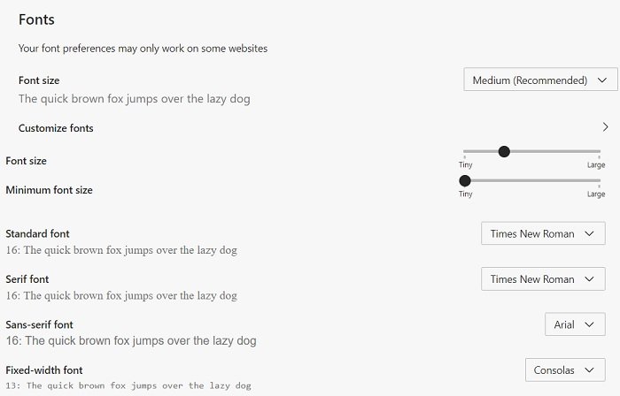 Además, Microsoft Edge también te permite cambiar la configuración de fuente. Aunque la configuración de fuente predeterminada en Edge es bastante buena y se adapta a todos, puedes ajustar el estilo de fuente, el tamaño de fuente, etc., si lo deseas. Desplácese hacia abajo en su página Apariencia y verá la configuración para ajustar el tipo y tamaño de fuente.