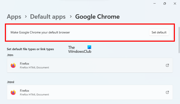 Si Google Chrome no está configurado como su navegador predeterminado, le mostrará una ventana emergente para configurarlo como navegador predeterminado cada vez que lo abra. Esta función está disponible en casi todos los navegadores web, lo que facilita a los usuarios configurar sus navegadores como predeterminados en sus sistemas. También puede hacer que Chrome o cualquier otro navegador sea su navegador predeterminado a través de la Configuración de Windows 11.