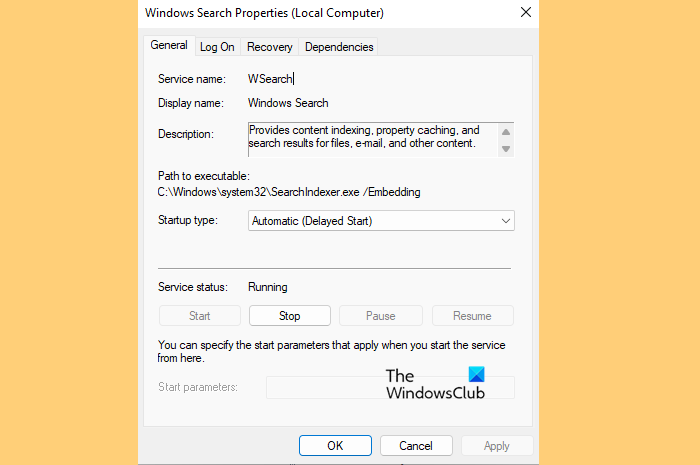 - Haga doble clic enBúsqueda de Windowspara abrir sus propiedades.