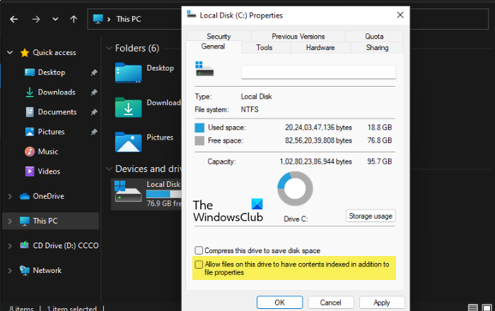 - Ir alGeneralpestaña, desmarcarPermitir que los archivos en esta unidad tengan contexto indexado además de las propiedades del archivo.y haga clic en Aceptar.