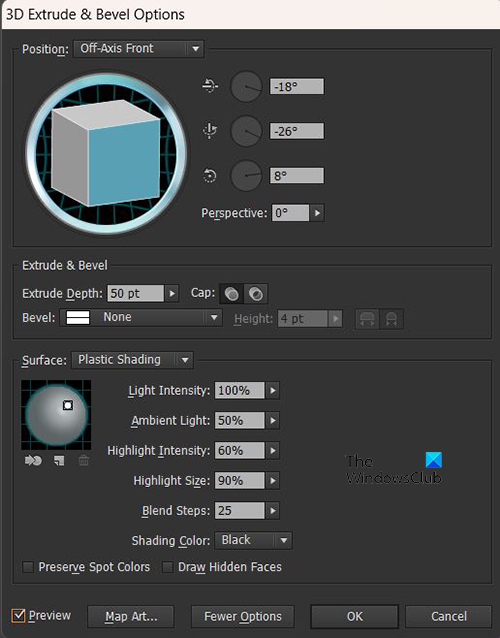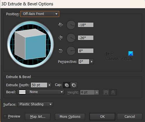 Puede ver más opciones para Extrusión 3D haciendo clic en Más opciones y verá que la ventana se extiende para mostrar más opciones.