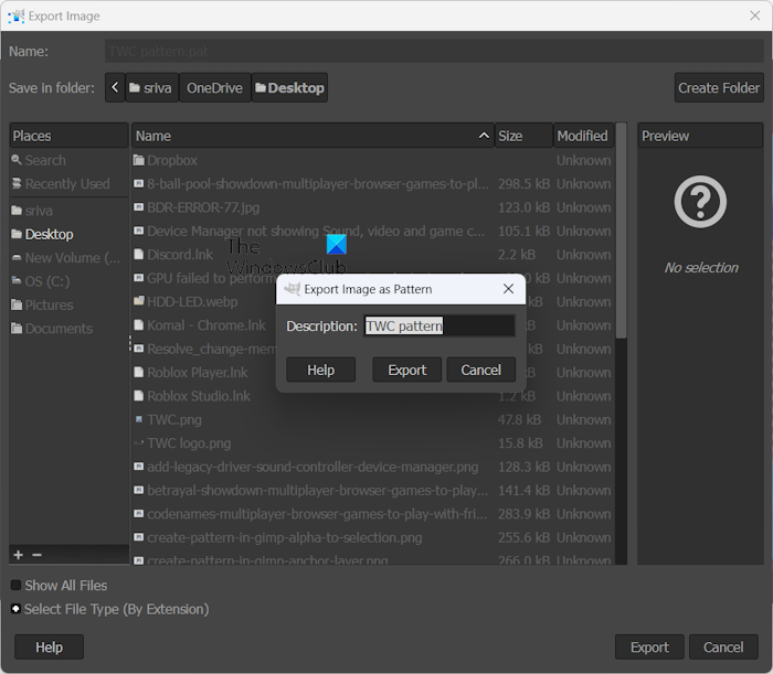 Luego, guarde el archivo como<filename> .pat y presione elExportarbotón. UnExportar imagen como patrónse abrirá el mensaje; simplemente ingrese la descripción del patrón y haga clic en elExportarbotón.