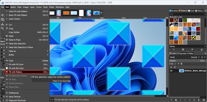 GIMP también proporciona una función dedicada para rellenar una imagen o lienzo con el patrón seleccionado. Puede usarlo siguiendo los pasos a continuación: