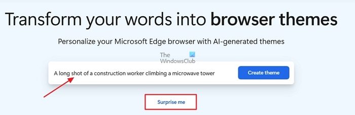 - También hay un botón llamadosorpréndeme, donde el navegador Edge sugiere algunas indicaciones interesantes y extravagantes que pueden usarse como tema para su navegador Edge. Por ejemplo, una toma larga de un trabajador de la construcción subiendo a una torre de microondas, una ciudad hecha de dulces de colores, etc.