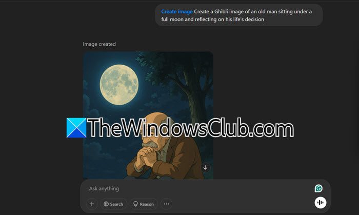 - Abra Copilot e ingrese su mensaje, por ejemplo. “Crea la imagen de Ghibli de un perro labrador”