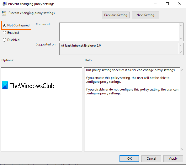 Si desea evitar que los usuarios cambien la configuración del Proxy en Windows 11/10, debe asegurarse de queEvitar cambiar la configuración del proxyEl GPO mencionado anteriormente en GPEDIT está configurado como habilitado.