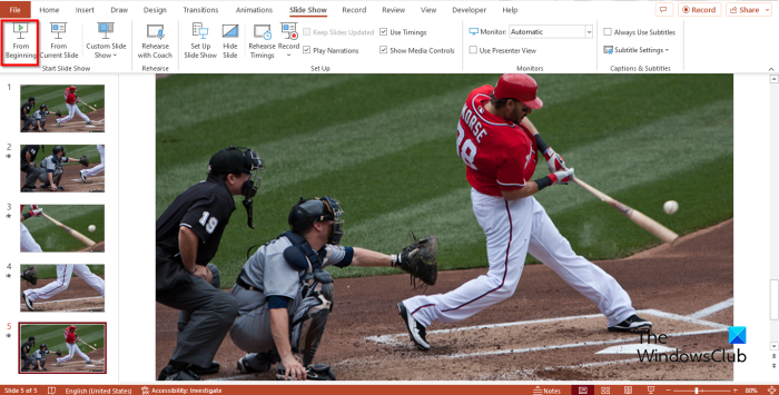 - Haga clic en la pestaña Presentación de diapositivas y luego haga clic en el botón Desde el principio.