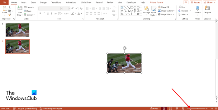 Ahora aleje la imagen de la segunda diapositiva presionando el botónControly desplazándose hacia abajo con el botón del mouse o haciendo clic en elalejaren la barra Zoom en la parte inferior derecha de la interfaz de PowerPoint.