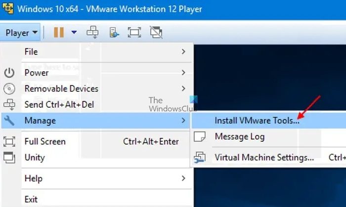 - Hacer clic enReproductor > Administrar > Instalar VMware Tools.