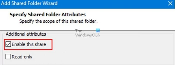 - En la siguiente pantalla, seleccione los atributos de compartir adicionales como Habilitar este recurso compartido o Solo lectura, según corresponda, y haga clic enFinalizar.