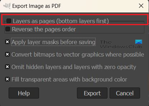 Es posible que desee exportar las capas de la ilustración de GIMP como páginas diferentes en el archivo PDF. Para hacer esto, siga los pasos anteriores (paso 4). Dado que la obra de arte tiene varias capas, se podrá hacer clic en las dos opciones de la ventana de opciones Exportar imágenes como PDF. Estas opciones sonCapas como páginas (la capa inferior primero)yInvertir el orden de las páginas. Las Capas como páginas (la capa inferior primero) colocarán primero la capa inferior en la ilustración de GIMP en el documento PDF.Invertir el orden de las páginasLa opción invertirá el orden de las capas en la ilustración de GIMP cuando se guarden como PDF.
