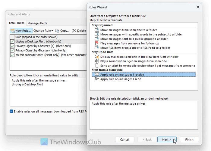 - SeleccionarAplicar regla en los mensajes que reciboy haga clic en Siguiente.