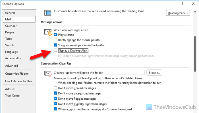 Por último, debes desactivar la alerta del escritorio para todos los demás mensajes. Ir aArchivo > Opciones > Correoy quitar la garrapata delMostrar una alerta de escritoriocaja.